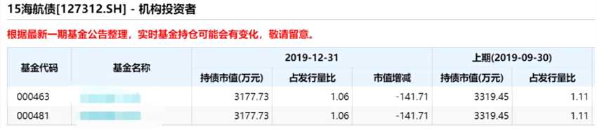 從機(jī)構(gòu)持倉(cāng)來(lái)看,有一只債券基金“踩雷”,截至2019年底,該債券持有市值3177.73萬(wàn)元,占發(fā)行量比1.06%,