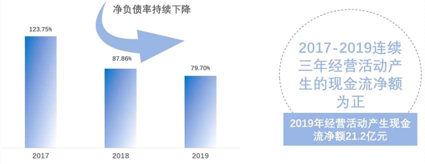 2019年,榮盛發(fā)展銷售回款達(dá)860億元,新增融資額478.03億元,良好的銷售回款和融資,使得公司的現(xiàn)金流狀況極大改善。經(jīng)營活動產(chǎn)生的現(xiàn)金流量凈額21.20億元,繼2017年、2018年后連續(xù)第三年為正。公司資產(chǎn)負(fù)債率82.45%、凈負(fù)債率79.70%,同比分別下降1.59個百分點、8.16個百分點,債務(wù)結(jié)構(gòu)持續(xù)改善。