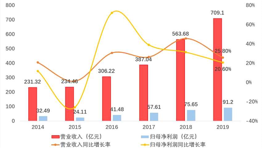 榮盛發(fā)展2019年保持業(yè)績高速增長的同時,營收和盈利表現(xiàn)同樣亮眼,各項財務(wù)指標(biāo)全面向好。年報數(shù)據(jù)顯示,2019年榮盛發(fā)展實現(xiàn)營業(yè)收入709.1億元,同比增長25.80%;實現(xiàn)營業(yè)利潤132.97億元,同比增長20.13%;歸屬于上市公司股東的凈利潤91.2億元,同比增長20.6%;扣非凈利潤達(dá)90.4億元,同比增長23.2%。榮盛營收和歸母凈利潤均實現(xiàn)連續(xù)三年同比增長超過20%,各項經(jīng)營指標(biāo)保持著良好的增長態(tài)勢。2015年至2019年,這五年期間,榮盛發(fā)展?fàn)I業(yè)收入和凈利潤的復(fù)合增長率分別為25%、30%。連續(xù)的穩(wěn)定增長使得榮盛發(fā)展的凈利潤在同等規(guī)模房企中處于領(lǐng)先地位。