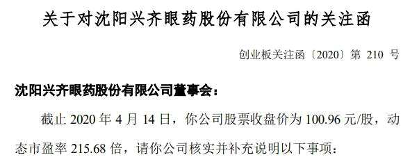 二級市場方面,截止2020年4月14日,興齊眼藥股票收盤價為100.96元/股,動態(tài)市盈率215.68倍。4月14日,深交所對其下發(fā)了關注函,要求說明 2020 年第一季度業(yè)績虧損且近年來業(yè)績波動較大的原因,受疫情影響的表述是否客觀準確,經營業(yè)績是否存在持續(xù)下滑的趨勢。并全面自查是否存在涉嫌內幕交易、市場操縱等情形。