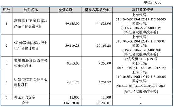 移遠通信上市時披露的公告書顯示,公司上市發(fā)行股份數量為2230萬股,募集資金總額為9.80億元,扣除發(fā)行費用后募集資金凈額為9.02億元,分別用于“高速率LTE通信模塊產品平臺建設項目”、“5G蜂窩通信模塊產業(yè)化平臺建設項目”、“窄帶物聯(lián)移動通信模塊建設項目”、“研發(fā)與技術支持中心建設項目”、“補充流動資金”。