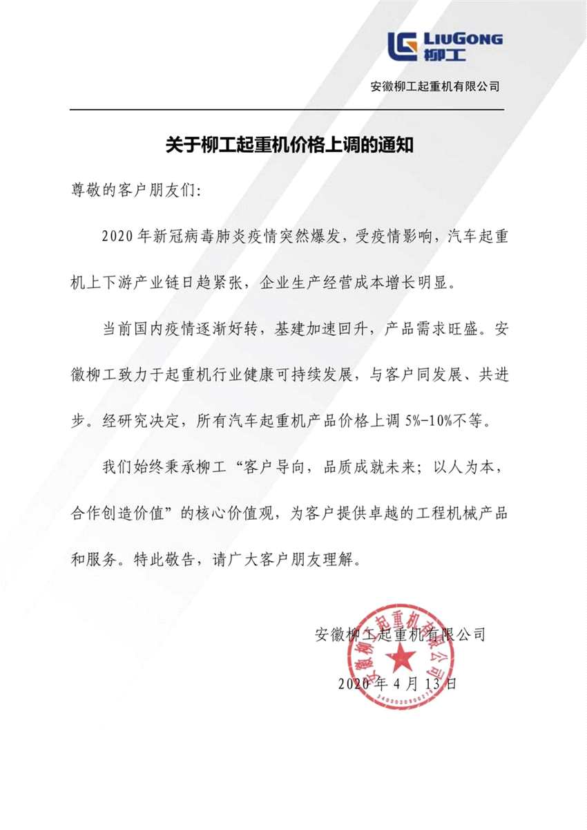 關(guān)于柳工起重機(jī)價格上調(diào)的通知