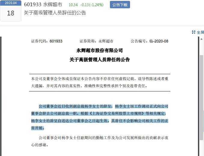 剛剛,永輝超市(601933)披露公告稱,副總裁楊李女士因工作調(diào)動正式向公司董事會辭去公司副總裁一職。