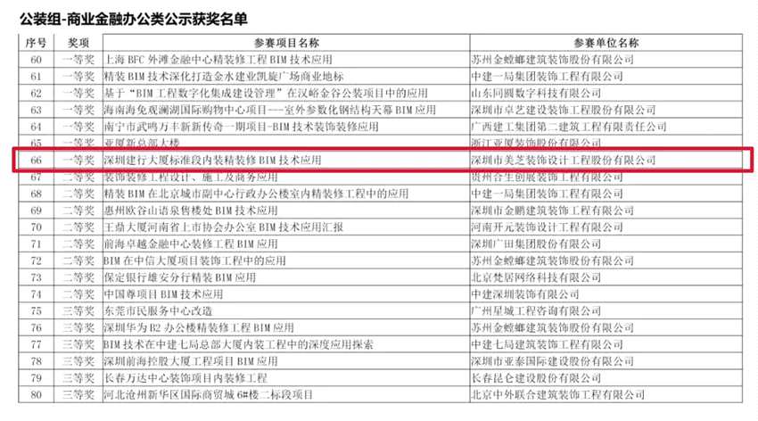 摘要: 近日,中國(guó)建筑裝飾協(xié)會(huì)舉辦的“首屆中國(guó)建筑裝飾BIM大賽”評(píng)選結(jié)果發(fā)布,美芝股份(002856)以卓越的實(shí)力斬獲三項(xiàng)一等獎(jiǎng),其中“深圳建行大廈標(biāo)準(zhǔn)段內(nèi)裝精裝修BIM技術(shù)應(yīng)用”獲得公裝組/商業(yè)金融辦公類