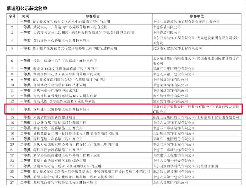 近日,中國(guó)建筑裝飾協(xié)會(huì)舉辦的“首屆中國(guó)建筑裝飾BIM大賽”評(píng)選結(jié)果發(fā)布,美芝股份(002856)以卓越的實(shí)力斬獲三項(xiàng)一等獎(jiǎng),其中“深圳建行大廈標(biāo)準(zhǔn)段內(nèi)裝精裝修BIM技術(shù)應(yīng)用” 獲得公裝組/商業(yè)金融辦公類一等獎(jiǎng);“深圳建行大廈幕墻工程BIM技術(shù)應(yīng)用”獲得幕墻組一等獎(jiǎng);“魯能領(lǐng)秀城C戶型精裝住宅BIM技術(shù)應(yīng)用”獲得家裝組一等獎(jiǎng)。