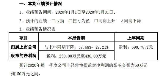 4月10日納川股份發(fā)布2020年第一季度業(yè)績預(yù)告,公告顯示,報告期內(nèi)預(yù)計盈利250萬元至430萬元,比上年同期減少57.68%至27.21%。