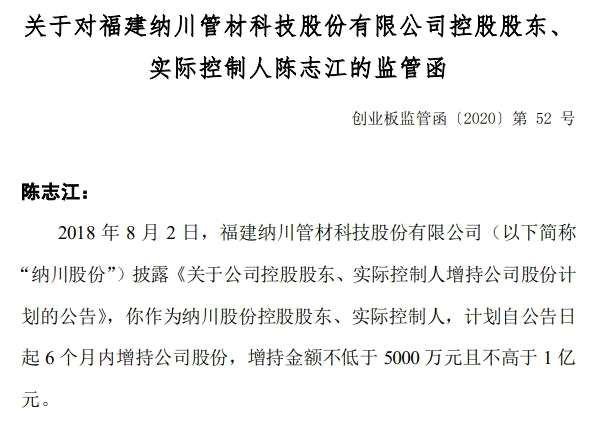 4月21日,深交所下發(fā)了關(guān)于對福建納川管材科技股份有限公司控股股東、實(shí)際控制人陳志江的監(jiān)管函,原因是陳志江1億上限的增持計劃實(shí)現(xiàn)額為0。