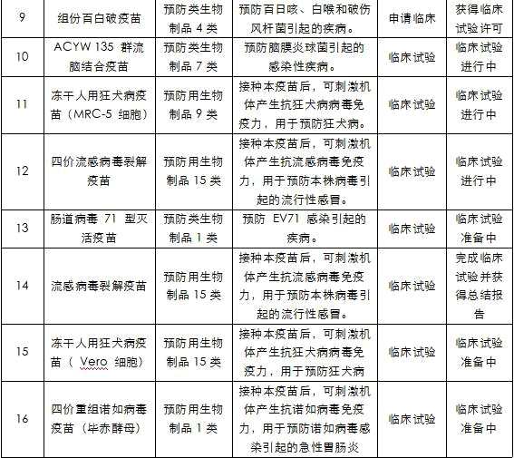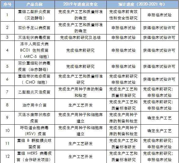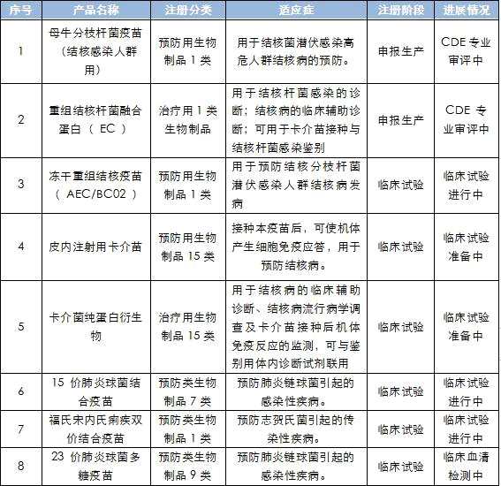 在研產(chǎn)品中,16個(gè)已進(jìn)入注冊程序,其中用于結(jié)核感染診斷的重組結(jié)核桿菌融合蛋白(EC)和母牛分枝桿菌疫苗(結(jié)核感染人群用)均為國家1類新藥,且均已完成臨床現(xiàn)場和生產(chǎn)現(xiàn)場核查,正在上市生產(chǎn)審評中,腸道病毒71型滅活疫苗、吸附無細(xì)胞百白破(組份)聯(lián)合疫苗、重組諾如病毒疫苗(畢赤酵母)報(bào)告期內(nèi)獲得臨床試驗(yàn)通知書;另有重組乙肝疫苗等12個(gè)產(chǎn)品處于臨床前研究階段。