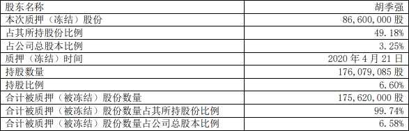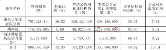 本次公告后,胡季強(qiáng)累計(jì)質(zhì)押數(shù)量為1.50億股。