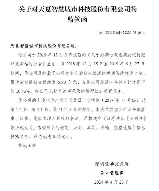 天夏智慧收監(jiān)管函 子公司5.9億逾期借款未信披