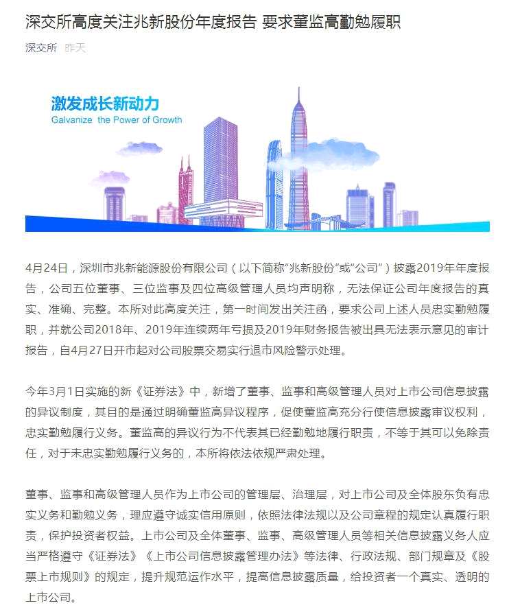 4月26日晚間,深交所微信公眾號刊發(fā)文章《深交所高度關(guān)注兆新股份年度報告 要求董監(jiān)高勤勉履職》,文中表示,在4月24日,深圳市兆新能源股份有限公司(以下簡稱“兆新股份”或“公司”)披露2019年年度報告,公司五位董事、三位監(jiān)事及四位高級管理人員均聲明稱,無法保證公司年度報告的真實、準確、完整。