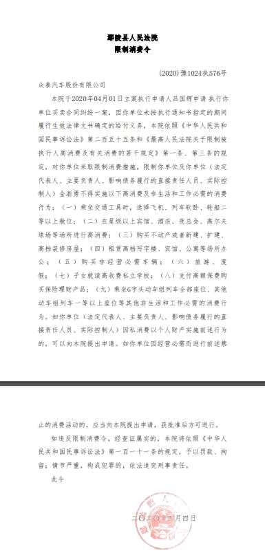 4月4日,眾泰汽車法定代表人金浙勇更是因未按法院判決書要求履行義務(wù),被鄢陵縣人民法院下發(fā)了限制高消費(fèi)令。