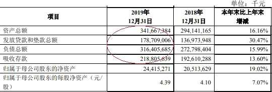 2019年,青農(nóng)商行資產(chǎn)總額為3416.67億元,發(fā)放貸款和墊款總額為1787.09億元;負(fù)債總額為3164.06億元,吸收存款2188.06億元。