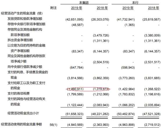 2019年,青農(nóng)商行支付給職工以及為職工支付的現(xiàn)金為14.91億元,上年同期為13.20億元。