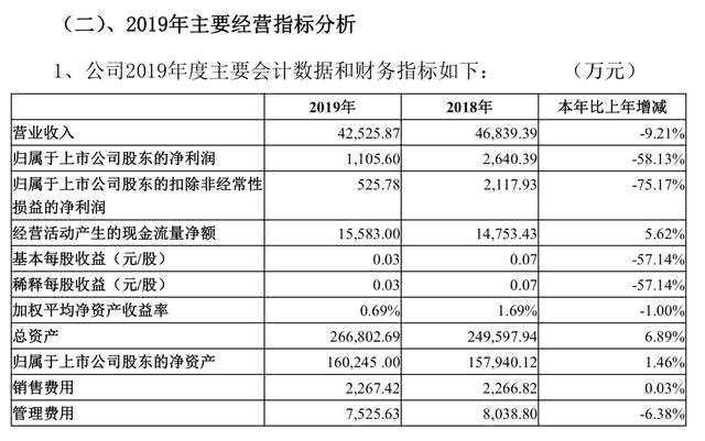 年報(bào)顯示,張家界2019年實(shí)現(xiàn)營(yíng)業(yè)收入4.25億元,較上年同期 4.68億元減少4313.52萬(wàn)元,減幅為9.21%;全年實(shí)現(xiàn)歸屬于上市公司股東的凈利潤(rùn)1105.59萬(wàn)元,較上年同期減少1534.8萬(wàn)元,減幅高達(dá)58.13%;全年實(shí)現(xiàn)歸屬于上市公司股東的扣除非經(jīng)常性損益的凈利潤(rùn)525.78萬(wàn)元,較上年同期2117.93萬(wàn)元減少1592.15萬(wàn)元,減幅高達(dá)75.17%。