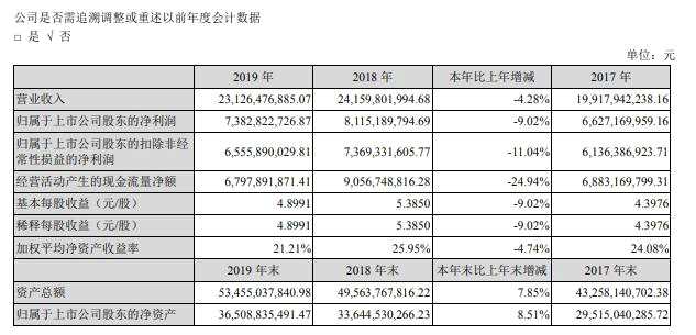洋河股份2019年凈利同比降9% 擬10派30元