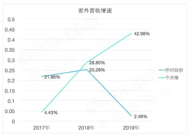 再看省外市場,洋河股份2017年實(shí)現(xiàn)營業(yè)收入92.39億元,增速21.86%;2018年?duì)I業(yè)收入115.75億元,增速25.28%,2019年?duì)I收118.62億元,增速只有2.48%。反觀,今世緣省外營收2017年增速4.43%雖不及洋河股份,但2018、2019年突飛猛進(jìn),增速分別達(dá)28.80%、54.96%。