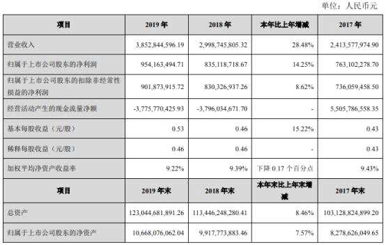 年報(bào)數(shù)據(jù)顯示,2019年,張家港行實(shí)現(xiàn)營業(yè)收入38.53億元,同比增長28.48%;實(shí)現(xiàn)歸屬于上市公司股東的凈利潤9.54億元,同比增長14.25%;實(shí)現(xiàn)歸屬于上市公司股東的扣除非經(jīng)常性損益的凈利潤9.02億元,同比增長8.62%;經(jīng)營活動(dòng)產(chǎn)生的現(xiàn)金流量凈額為-37.76億元,上年同期為-37.96億元。