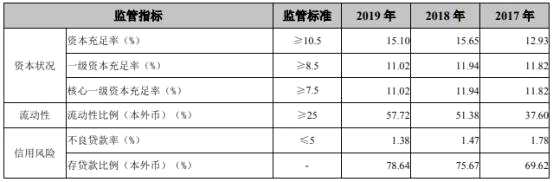 在資本充足率方面,2017年-2019年,張家港行的資本充足率分別為12.93%、15.65%、15.10%,一級資本充足率分別為11.82%、11.94%、11.02%,核心一級資本充足率分別為11.82%、11.94%、11.02%。