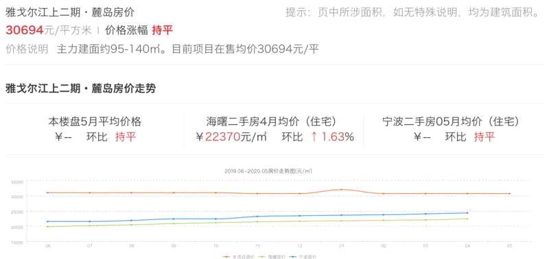 此外,查看該樓盤房價走勢了解到,該樓盤主力建面約95-140平米房在售均價為30694元/平米,而寧波海曙區(qū)4月二手房住宅均價為22370元/平米,環(huán)比上漲1.63%,而5月上述房價顯示為“持平”;另,房價數(shù)據(jù)走勢顯示,寧波房價近一年來均價微漲,接近25000元下限附近。