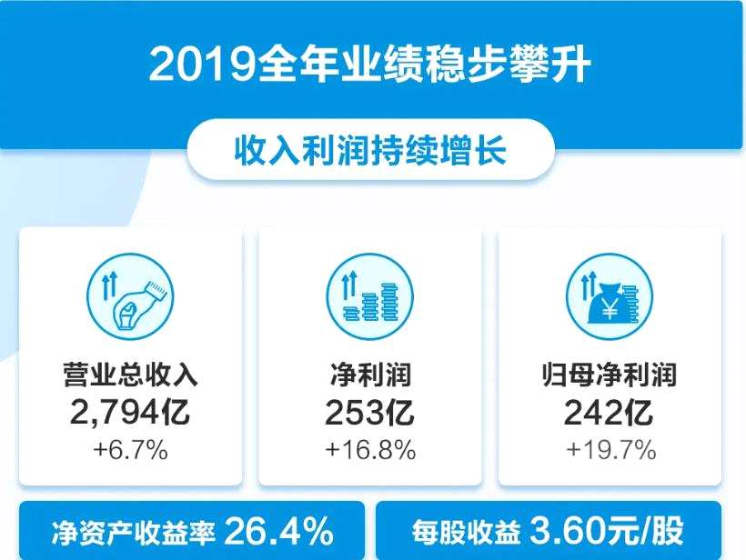 據(jù)美的集團(tuán)(SZ.000333)公告顯示,2019年上市公司實(shí)現(xiàn)營(yíng)業(yè)收入為2793.81億元,同比增長(zhǎng)了6.71%;實(shí)現(xiàn)歸屬母公司凈利潤(rùn)達(dá)到了242.11億元,同比增長(zhǎng)了19.68%。對(duì)比過(guò)往歷史數(shù)據(jù)可以看到,美的集團(tuán)在2019年的營(yíng)業(yè)收入和凈利潤(rùn)都創(chuàng)下了歷史新高。