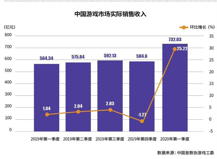 中國音數(shù)協(xié)游戲工委此前公布的數(shù)據(jù)顯示,今年一季度中國游戲市場實(shí)際銷售收入732.03億元,環(huán)比增長25.22%,同比增長25.26%,相比此前幾個季度1%―3%的增速水平而言,實(shí)現(xiàn)了爆發(fā)式的增長。