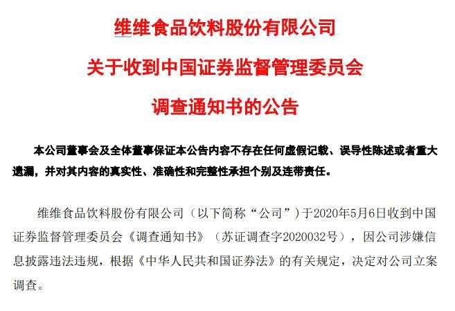 客戶端5月6日電 【維維股份(600300)、股吧】(600300)6日晚間公告稱,維維食品飲料股份有限公司于2020年5月6日收到中國證券監(jiān)督管理委員會《調(diào)查通知書》(蘇證調(diào)查字2020032號),因公司涉嫌信息披露違法違規(guī),決定對公司立案調(diào)查。