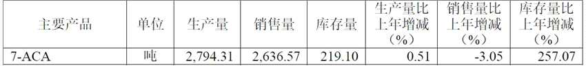具體來(lái)看,公司主要產(chǎn)品7-ACA的銷售量下滑,直接導(dǎo)致相應(yīng)庫(kù)存量增加。報(bào)告期內(nèi),7-ACA產(chǎn)品的生產(chǎn)量為2794.31噸,較上年增加0.51%,然而在生產(chǎn)量增加的同時(shí),公司的銷售量卻拖后腿,銷售量為2636.57噸,同比下降3.05%,這也直接導(dǎo)致相應(yīng)產(chǎn)品的庫(kù)存量增加了219.10噸,同比增加幅度高達(dá)257.07%。
