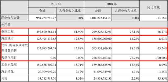雖然巴安水務(wù)營收在同行中偏小,但是分產(chǎn)品來看,巴安水務(wù)涉及的業(yè)務(wù)可不少。第一大業(yè)務(wù)市政工程實(shí)現(xiàn)營收4.98億元,同比大增66.27%,占比也從2018年的27.11%大幅提升到51.9%,市政工程2019年毛利率為39.96%,同比上升9.29個(gè)百分點(diǎn)。不過2018年的第二、第三大業(yè)務(wù)天然氣項(xiàng)目和氣浮、陶瓷膜及水處理設(shè)備收入在2019年大減,一個(gè)減少為0另一個(gè)大降35.24%,成了拖累巴安水務(wù)營收下滑的主因。