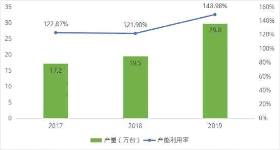 2017-2019年,錦浪科技產(chǎn)品銷售快速增長(zhǎng),公司產(chǎn)量分別為17.20萬(wàn)臺(tái)、19.50萬(wàn)臺(tái)、29.80萬(wàn)臺(tái),營(yíng)業(yè)收入年均復(fù)合增長(zhǎng)率為17.61%,同期錦浪逆變器產(chǎn)能利用率均超過(guò)120%,在過(guò)往年度產(chǎn)能處于極高的利用狀態(tài)。