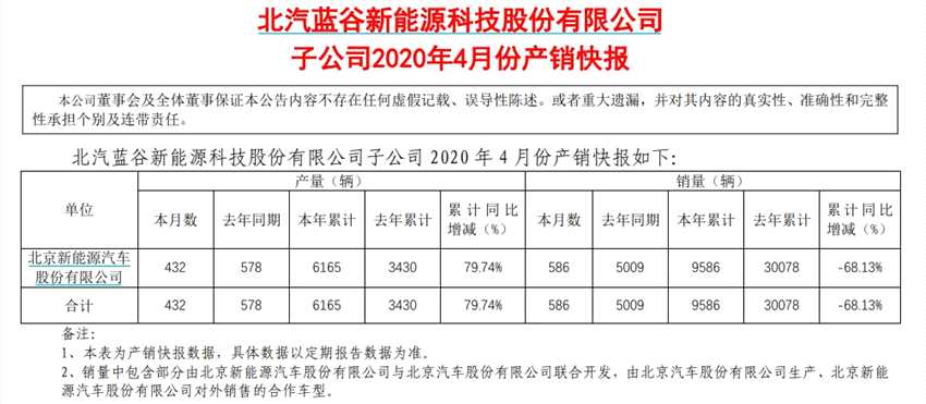 5月8日晚間,北汽藍谷(600733)發(fā)布子公司北汽新能源2020年4月份的產(chǎn)銷快報。