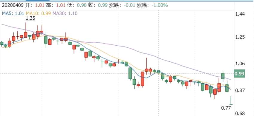 5月8日再度跌停,已連續(xù)19個(gè)交易日收盤價(jià)格均低于1元人民幣的面值,即便下一個(gè)交易日漲停,也鐵定將觸及面值退市標(biāo)準(zhǔn)。
