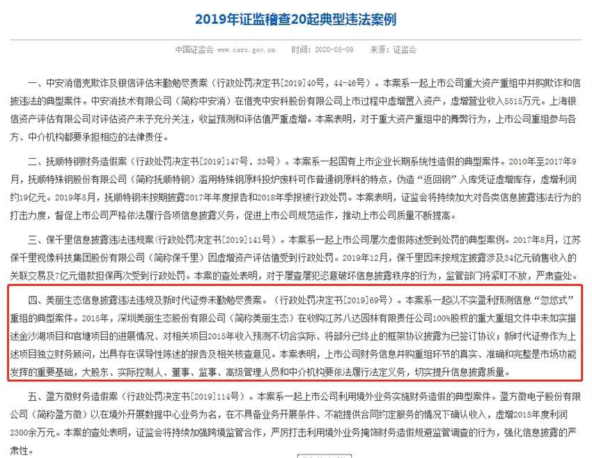 日前,5月9日,證監(jiān)會官網(wǎng)公布《2019年證監(jiān)稽查20起典型違法案例》提及美麗生態(tài)信息披露違法違規(guī)及新時代證券未勤勉盡責案。證監(jiān)會介紹,本案系一起以不實盈利預測信息“忽悠式”重組的典型案件。2015年,深圳美麗生態(tài)股份有限公司(簡稱美麗生態(tài))在收購江蘇八達園林有限責任公司100%股權的重大重組文件中未如實描述金沙湖項目和官塘項目的進展情況、對相關項目2015年收入預測不切合實際、將部分已終止的框架協(xié)議披露為已簽訂協(xié)議;新時代證券作為上述項目獨立財務顧問,出具存在誤導性陳述的報告及相關核查意見。本案表明,上市公司財務信息并購重組環(huán)節(jié)的真實、準確和完整是市場功能發(fā)揮的重要基礎,大股東、實際控制人、董事、監(jiān)事、高級管理人員和中介機構(gòu)要依法履行法定義務,切實提升信息披露質(zhì)量。