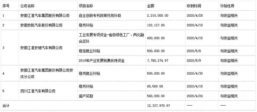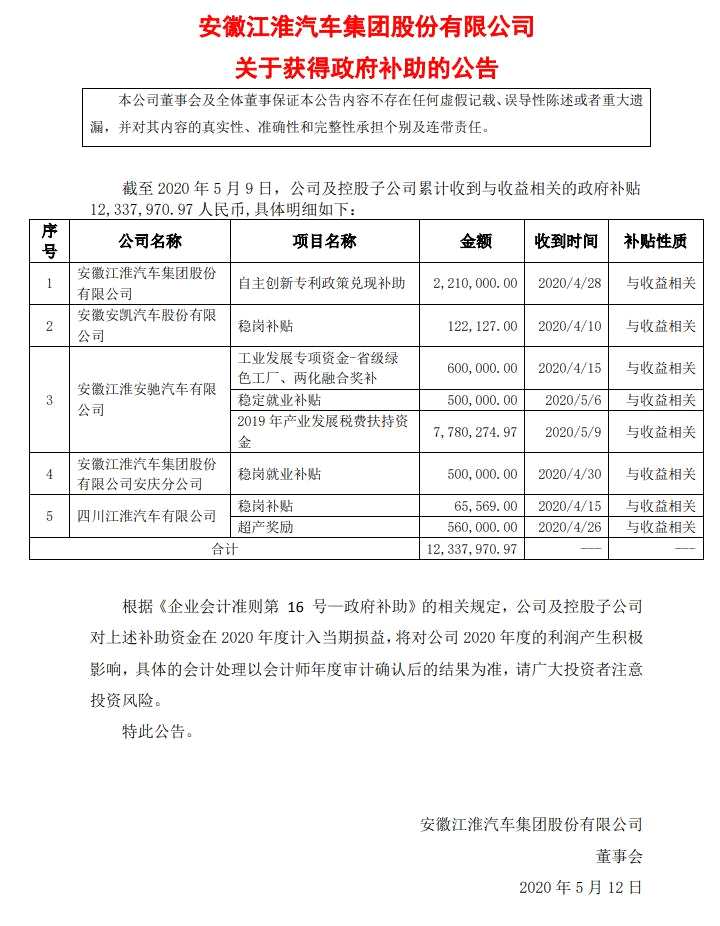 2020年5月12日,安徽江淮汽車(600418)集團股份有限公司(以下簡稱“公司”)發(fā)布關于獲得政府補助的公告。截至2020年5月9日,公司及控股子公司累計收到與收益相關的政府補貼12,337,970.97人民幣,具體明細如下:
