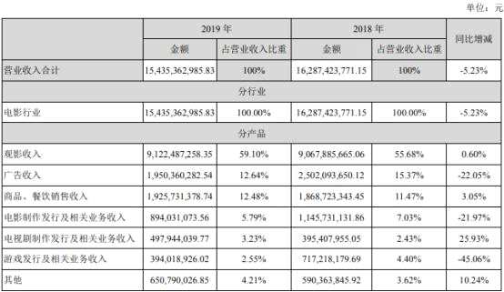 公司按產(chǎn)品分類可由觀影收入、廣告收入、商品及餐飲銷售收入、電影制作發(fā)行及相關業(yè)務收入、電視劇制作發(fā)行及相關業(yè)務收入、游戲發(fā)行及相關業(yè)務收入和其他收入構成。2019年公司觀影收入91.22億元,占營收比重的59.10%,同比增長0.60%;廣告收入實現(xiàn)19.50億元,占營收比重12.64%,同比減少22.05%;商品及餐飲銷售收入19.26億元,占營收比重12.48%,同比增長3.05%;電影制作發(fā)行及相關業(yè)務收入8.94億元,占營收比重5.79%,同比減少21.97%;電視劇制作發(fā)行及相關業(yè)務收入4.98億元,占營收比重3.23%,同比增長25.93%;、游戲發(fā)行及相關業(yè)務收入3.94億元,占營收比重2.55%,同比減少45.06%;其他收入6.51億元,占營收比重4.21%,同比增長10.24%。