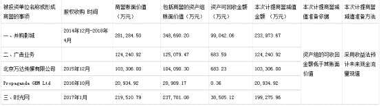 (3)并購影城業(yè)務、廣告業(yè)務和時光網(wǎng)資產(chǎn)組計提商譽減值金額分別占其商譽賬面價值 83.18%,100%,90.78%。請你公司結合上述資產(chǎn)組的并購時點、并購時的估值、業(yè)績承諾完成情況、導致資產(chǎn)可回收金額產(chǎn)生重大變化的關鍵參數(shù)的計算過程等因素說明上述資產(chǎn)組計提商譽減值金額及時點的合理性,是否存在調節(jié)利潤的情形。