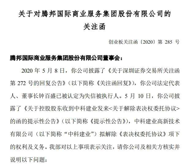 5月13日電 13日晚,深交所向騰邦國際(300178)商業(yè)服務(wù)集團(tuán)股份有限公司(后文簡稱“騰邦國際”),就“公司法定代表人、董事長鐘百盛被認(rèn)定為失信被執(zhí)行人”等事項問詢。
