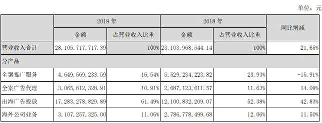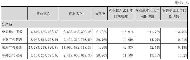 藍(lán)色光標(biāo)公司產(chǎn)品主要由全案推廣服務(wù)、全案廣告代理、出海廣告投放及海外公司業(yè)務(wù)四部分構(gòu)成。報(bào)告期內(nèi),全案推廣服務(wù)實(shí)現(xiàn)營(yíng)收46.50億元,占營(yíng)收比重16.54%,同比減少15.91%,毛利率21.92%,同比減少3.70%;全案廣告代理實(shí)現(xiàn)營(yíng)收30.66億元,占營(yíng)收比重10.91%,同比增長(zhǎng)14.09%,毛利率20.76%,同比增長(zhǎng)0.01%;出海廣告投放實(shí)現(xiàn)營(yíng)收172.83億元,占營(yíng)收比重61.49%,同比增長(zhǎng)42.83%,毛利率1.29%,同比增長(zhǎng)0.18%;海外公司業(yè)務(wù)實(shí)現(xiàn)營(yíng)收31.07億元,占營(yíng)收比重11.06%,同比增長(zhǎng)11.50%,毛利率20.20%,同比減少1.32%。