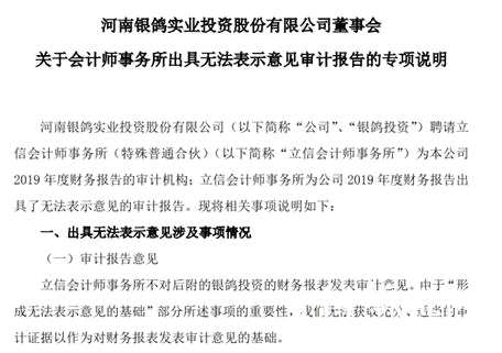 這就不難理解,立信會(huì)計(jì)師事務(wù)所(特殊普通合伙)對(duì)公司2019年年報(bào)出具的無(wú)法表示意見(jiàn)的審計(jì)報(bào)告了。注冊(cè)會(huì)計(jì)師受工作范圍限制,無(wú)法對(duì)財(cái)務(wù)報(bào)表獲取充分適當(dāng)?shù)膶徲?jì)證據(jù),因此只能發(fā)表”無(wú)法表示意見(jiàn)”。