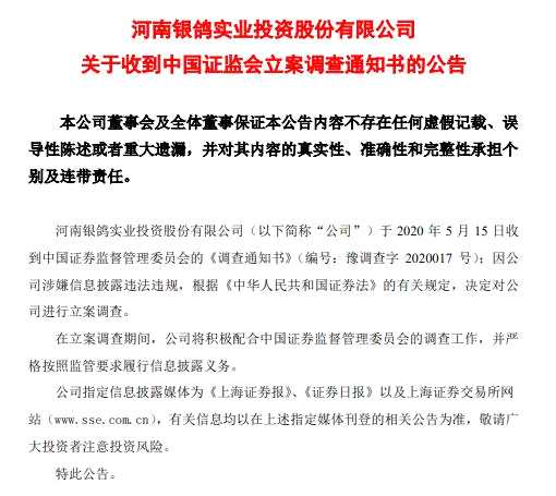 之前,連續(xù)報(bào)道了銀鴿投資兩年連虧,改名“*ST銀鴿(600069)”后,股價(jià)已連續(xù)4個(gè)交易日低于。如今每況愈下,收到證監(jiān)會(huì)的《調(diào)查通知書》,公告指出銀鴿因涉嫌信息披露違法違規(guī),將被立案調(diào)查。