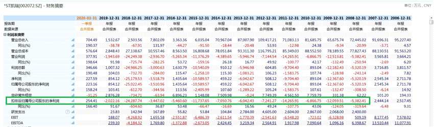 深交所指出,2019年*ST凱瑞的營業(yè)收入僅為1532.6萬元,較2018年下降38.78%,公司已經(jīng)連續(xù)多年扣非后虧損,凈資產(chǎn)僅為2358.46萬元。此外,報告期內(nèi)公司存在大額債務(wù)逾期、欠繳稅款、被立案調(diào)查等情形,導(dǎo)致持續(xù)經(jīng)營能力存在重大不確定性。另數(shù)據(jù)顯示,*ST凱瑞扣非凈利自2008年以來,已連續(xù)12年虧損。
