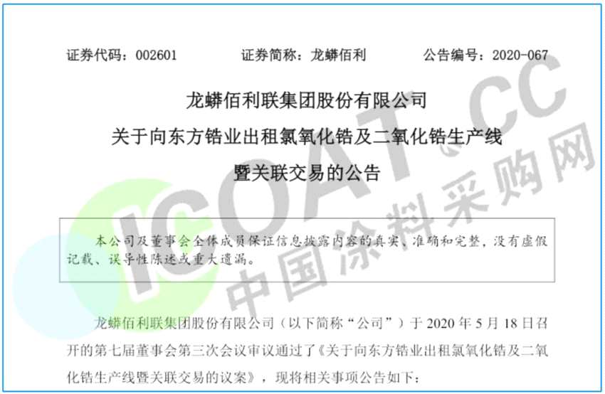 同期,龍蟒佰利聯(lián)集團(tuán)股份有限公司公布公告,稱公司于 2020 年 5 月 18 日召開的第七屆董事會(huì)第三次會(huì)議審議通過了《關(guān)于向【東方鋯業(yè)(002167)、股吧】(002167)出租氯氧化鋯及二氧化鋯生產(chǎn)線暨關(guān)聯(lián)交易的議案》。