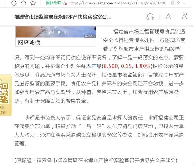 據(jù)新浪財(cái)經(jīng)于2020年5月10日晚轉(zhuǎn)載來自消費(fèi)日?qǐng)?bào)網(wǎng)的文章《福建省市場監(jiān)管局在永輝水產(chǎn)快檢實(shí)驗(yàn)室召開食品安全座談會(huì)》,顯示,“近日,福建省市場監(jiān)督管理局食品流通安全監(jiān)管處、食品抽檢處、福建省產(chǎn)品質(zhì)量檢驗(yàn)研究院等單位在永輝超市設(shè)于福州馬尾大名城(600094)的水產(chǎn)快速檢測(cè)實(shí)驗(yàn)室召開座談會(huì)?!?/p>