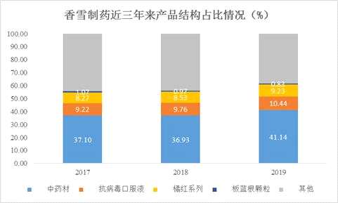 分業(yè)務看,2019年,中藥材、抗病毒口服液、橘紅系列營收占比分別為41.14%、10.44%、9.23%,毛利率分別為25.74%、47.94%、54.09%,其中,中藥材營收占比從2017年的37.10%增長到了2019年的41.14%,而中藥材的毛利率顯著低于其他業(yè)務,拉低公司整體毛利率。
