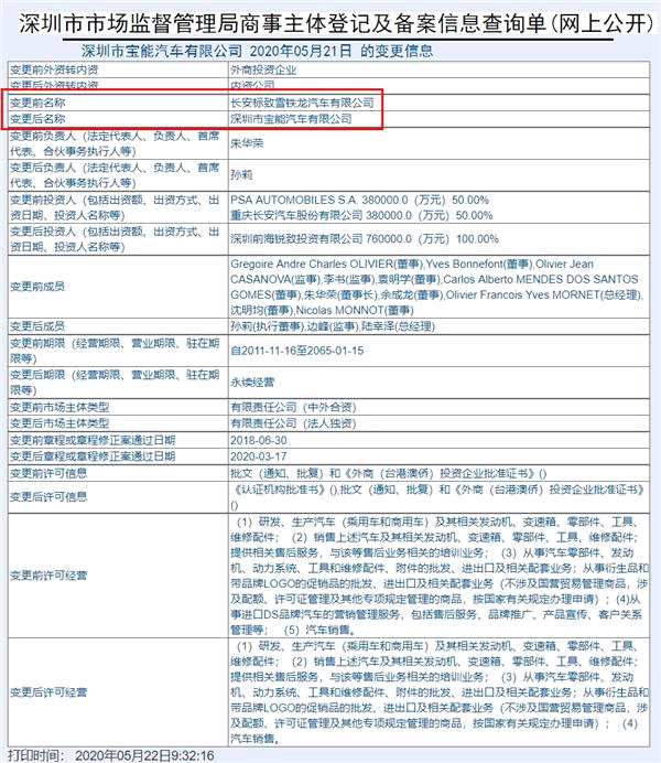 5月21日,深圳市市場(chǎng)監(jiān)督管理局網(wǎng)站信息顯示,長(zhǎng)安標(biāo)致雪鐵龍汽車有限公司(簡(jiǎn)稱“長(zhǎng)安PSA”)已變更為深圳市寶能汽車有限公司,意味著長(zhǎng)安PSA正式更名為寶能汽車。