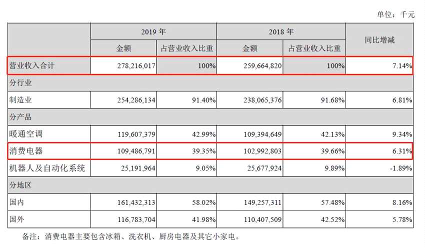 美的集團2019年全年實現(xiàn)營業(yè)收入2782.16億元,同比增長7.14% ;屬于母公司股東的凈利潤242.11億元,同比增長19.68%。其中消費電器(冰箱、洗衣機、廚房電器及其它小家電)方面,全年實現(xiàn)營業(yè)收入1094.87億元,同比增長6.31%。