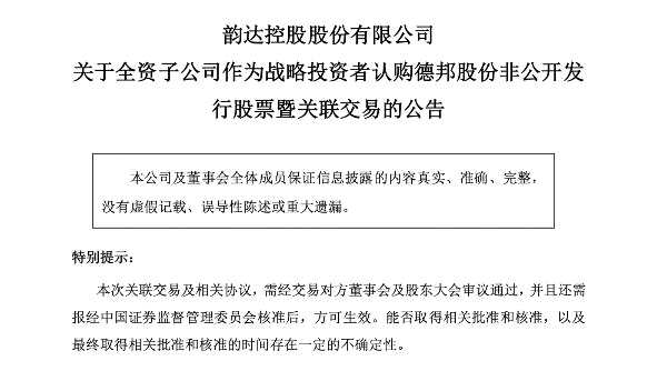 5月24日,韻達(dá)發(fā)布公告,擬通過全資子公司寧波福杉作為戰(zhàn)略投資者,寧波福杉擬以自有資金和自籌資金認(rèn)購6.14億元,擬認(rèn)購數(shù)量約為6674萬股。交易完成后,將持有德邦股份(603056)的股權(quán)比例約為6.5%。