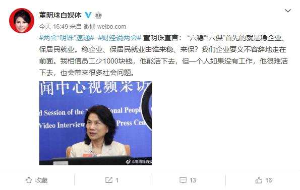 5月25日消息 根據(jù)微博@董明珠自媒體的消息,兩會(huì)期間,董明珠在接受采訪時(shí)表示:“六穩(wěn)”“六?!笔紫鹊木褪欠€(wěn)企業(yè)、保居民就業(yè)。企業(yè)的生命力體現(xiàn)在遭遇不可抗力時(shí)的風(fēng)險(xiǎn)防控能力,這個(gè)時(shí)候還能呵護(hù)我的員工,讓他們?cè)谶@很安全,我們就要做這種風(fēng)險(xiǎn)防控,今年一下真的給兌現(xiàn)了。