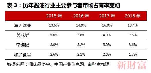 過去30年間,調(diào)味品行業(yè)發(fā)生了較大的市場變動。今天,在中國的每一個地級市里,都已有海天的身影。醬油行業(yè)中,曾經(jīng)的龍頭加加醬油日漸頹落,而新的老大海天則獨(dú)領(lǐng)風(fēng)騷。其市場份額從2015年的13.6%上升到2018年的18.4%,提升了近5個點(diǎn);而同期美味鮮、李錦記分別只提升了2.6、0.6個百分點(diǎn)。曾經(jīng)的醬油第一股加加醬油,份額更是一路下降,根據(jù)調(diào)味品協(xié)會的數(shù)據(jù),其2018年份額只有1.7%(表3)