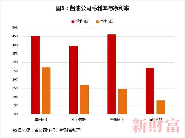 正因?yàn)槿绱?,海天的醬油產(chǎn)品即使價位低于廚邦和千禾,綜合毛利率仍高于后兩者。2019年海天的綜合毛利率為45.44%,中炬高新為39.55%,千禾味業(yè)46.21%。
